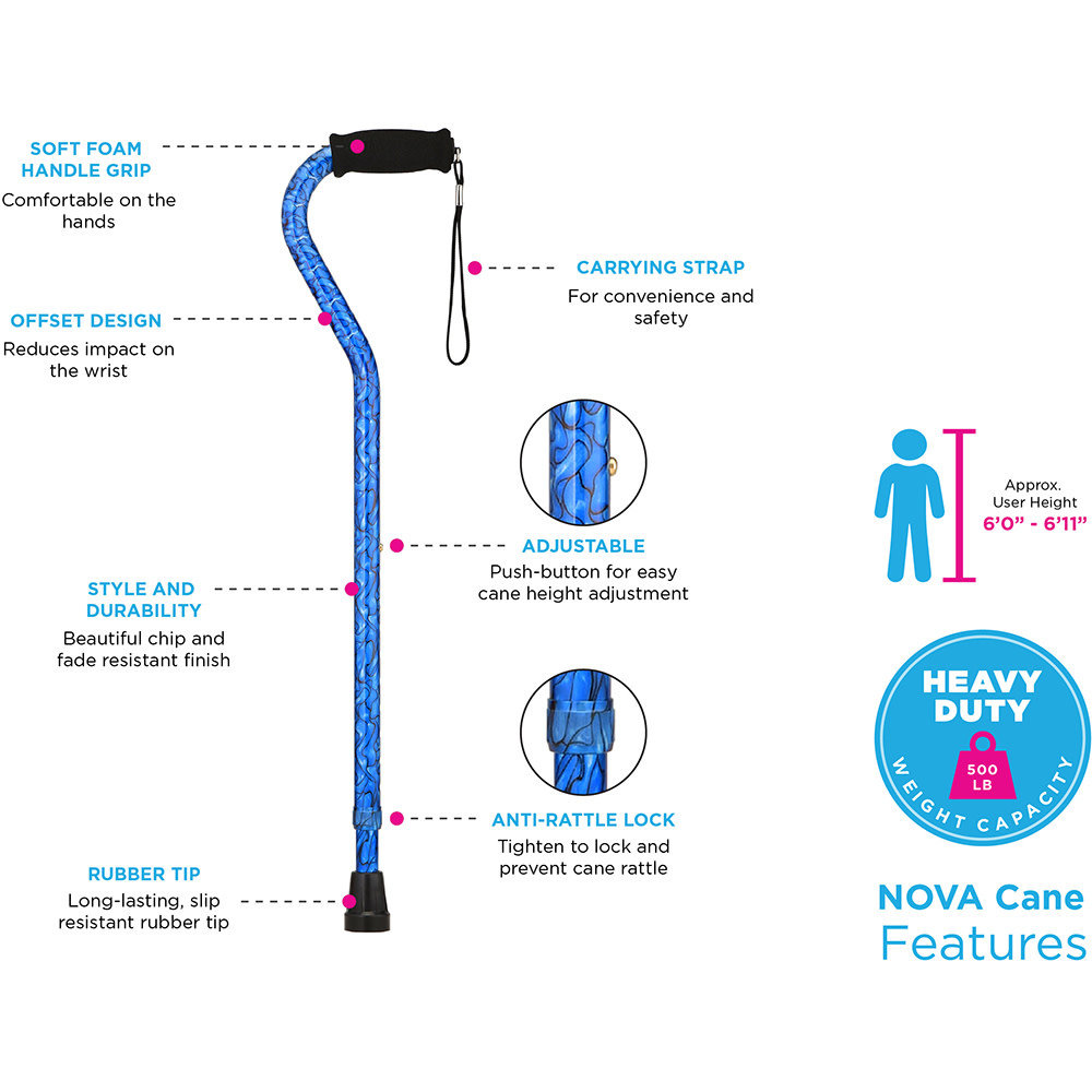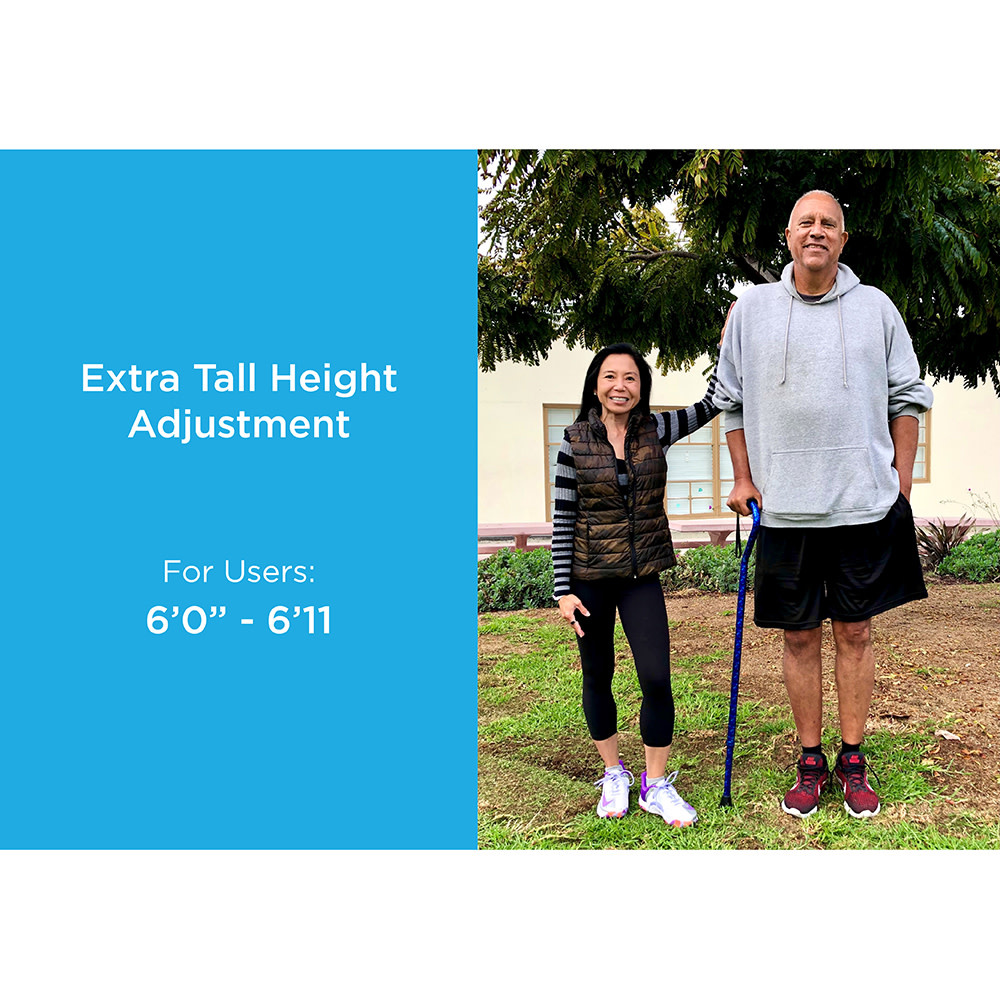 Extra Tall Height Adjustment: This cane is specifically designed for taller individuals, with an adjustable height range suitable for users approximately 6’0" to 6’11". Whether you’re exceptionally tall or just need that extra height, this cane has you covered. Lightweight Aluminum Construction: Despite its sturdy build, the NOVA HD cane remains lightweight and easy to handle. You won’t feel weighed down as you move around. Fade and Chip Resistant: The durable construction ensures that the cane maintains its appearance over time. It won’t fade or chip easily, even with regular use. Comfortable Foam Hand Grip: The ergonomic foam grip provides a comfortable and secure hold. It’s essential for stability and confidence while walking. Convenient Carrying Strap: The included strap allows you to hang the cane over your shoulder when not in use. No need to worry about where to put it when you’re out and about. Impressive Weight Capacity: With a weight capacity of up to 500 lb, this heavy-duty cane provides robust support. It’s suitable for users who require extra strength and stability.