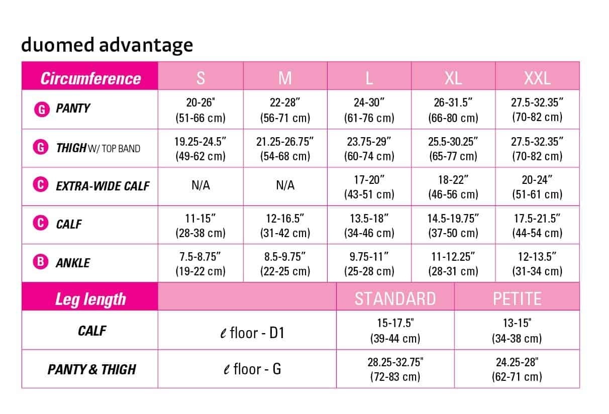 Duomed advantage compression socks for men and women provide opaque coverage and support to treat the symptoms of vein disease. With a soft, luxurious feel, duomed advantage will keep you feeling comfortable and rejuvenated all day long. duomed advantage calf products are available in closed or open toe options); in 15-20, 20-30, and 30-40 mmHg compression levels); extra-wide calf variants); and in beige, almond, or black colors.