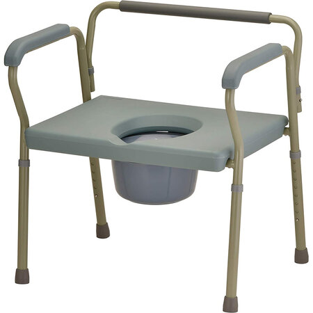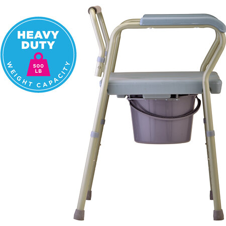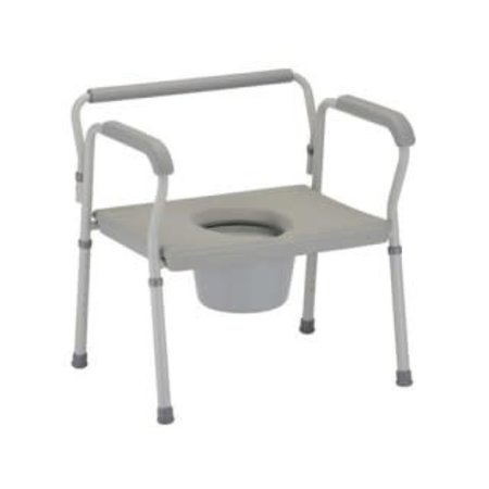 The Heavy Duty Commode has an extra-wide design, capable of supporting up to 500 lbs. It has a toilet seat opening of 8? x 10.5?, and comes complete with a bucket, lid and splash guard.