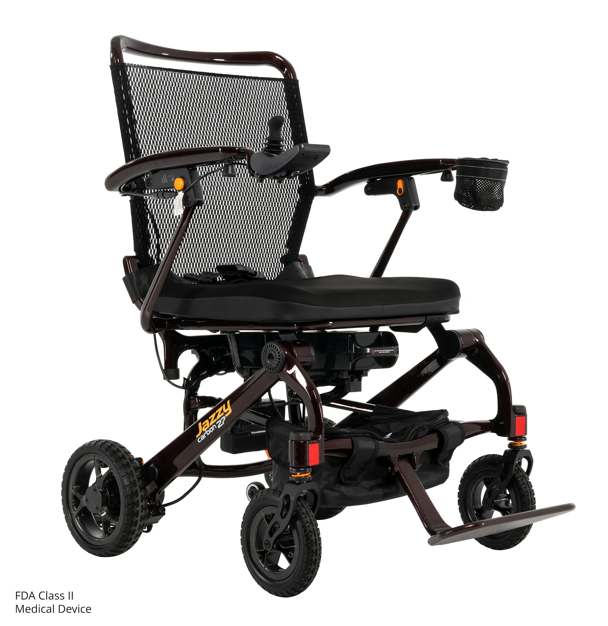 Designed with travel and storage in mind, the Jazzy Carbon 27 features an easy-fold design that secures neatly with a strap for quick transport. When folded, its compact dimensions (27.5” L x 23.4” W x 13.38” H) make it easy to fit into vehicle trunks, closets, and tight storage spaces. Flip-up lightweight carbon fiber armrests, a compact base, and an accessible release lever ensure the chair folds and unfolds effortlessly, making it ideal for frequent travelers and daily users alike.