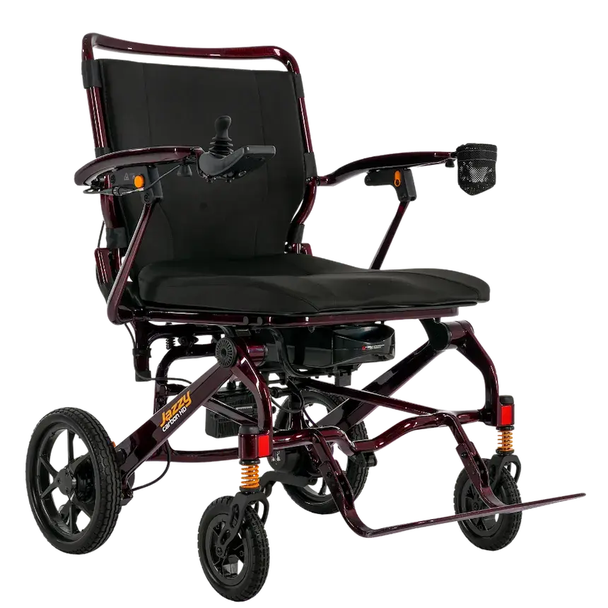 The Pride Mobility Jazzy Carbon HD is an ultra-lightweight, heavy-duty folding power chair. Its carbon fiber frame weighs just 32.2lbs (without battery) yet supports up to 400 lbs. It features full suspension and a 12.4-mile range. Read more