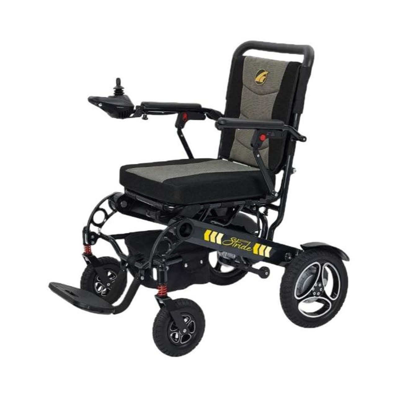 The all-new Stride Power Wheelchair will take you where you want to go in comfort and style! The Stride is stylish with a two-tone grey and black seat with removable cushion and a tall back for long-lasting comfort while on the go. Modern-looking front and back comfort spring suspension add to the smooth ride. The sporty design is perfect for navigating indoors and out while sightseeing, shopping, or dining. This portable folding power chair is lightweight with an aluminum frame and stows easily in the trunk of your car. Weighing as light as 52.6 lbs.*, the Stride is the perfect choice to take on road trips, cruise ships and airplanes. The Stride features a well-styled joystick designed to make everyday tasks easier such as driving up to a table or maneuvering through a doorway. It has an impressive 23.6” turning radius and offers a 265 lb. weight capacity, maximum speed of 3.7 mph, and an operating range of up to 9.3 miles on airline-approved 10AH 24V lithium-ion batteries. It also offers convenient offboard charging and folds effortlessly for transport.